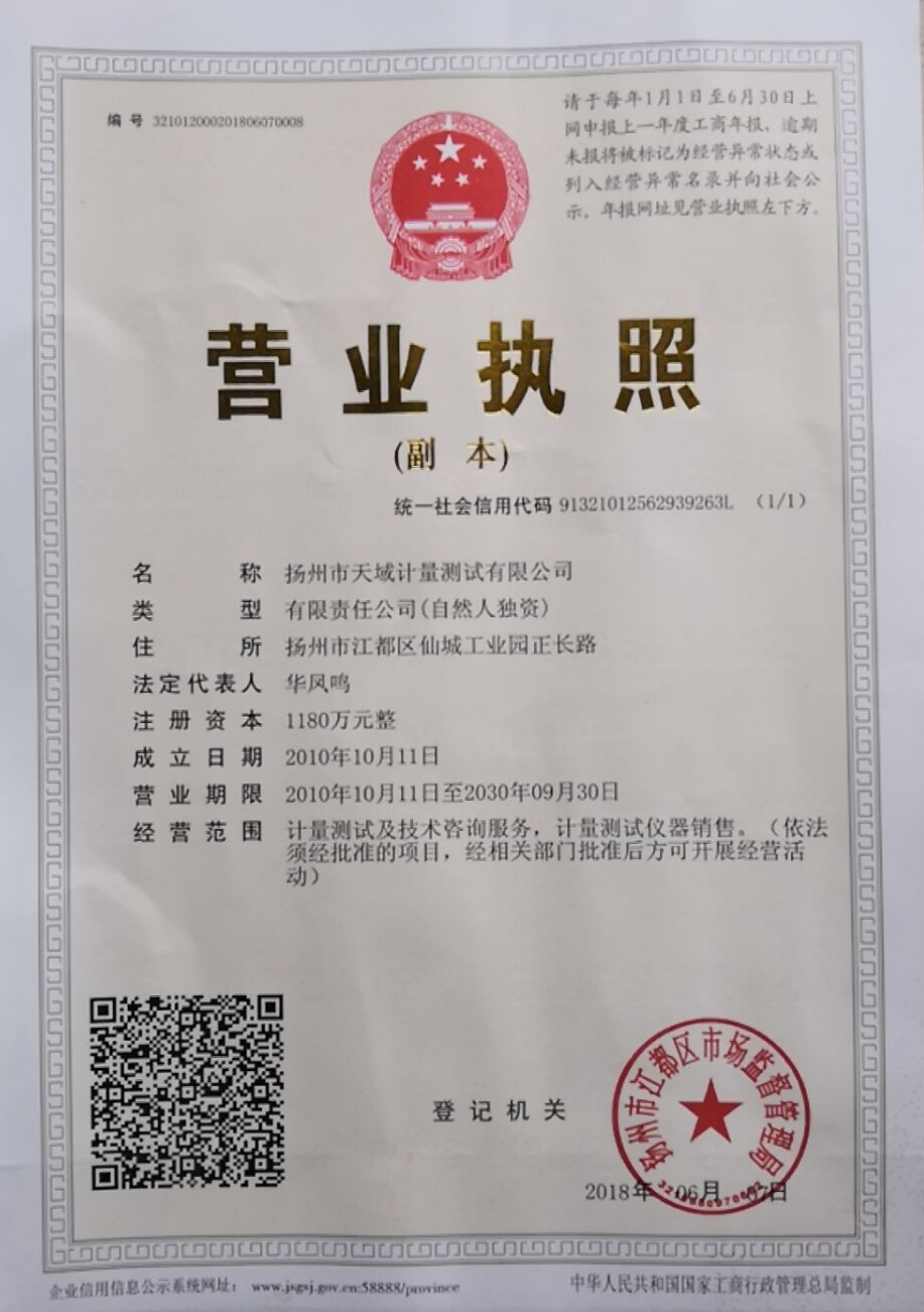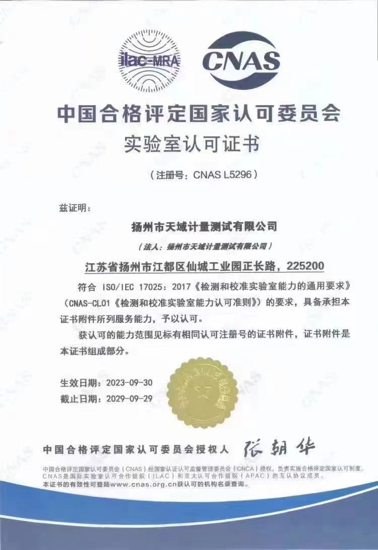 揚(yáng)州市天域計(jì)量測(cè)試有限公司,坐落在交通便利的揚(yáng)州市江都區(qū)仙城工業(yè)園,成立于2010年10月,2011年11月正式獲取中國(guó)合格評(píng)定國(guó)家認(rèn)可委員會(huì)認(rèn)可(授權(quán)),注冊(cè)號(hào):CNAS L5296。近幾年的發(fā)展,實(shí)驗(yàn)室已具備了較大規(guī)模,并形成了集計(jì)量器具檢測(cè),計(jì)量技術(shù)咨詢和計(jì)量器具銷售為一體的專業(yè)化技術(shù)機(jī)構(gòu),客戶覆蓋蘇南、蘇北、和浙江,安徽部分地區(qū),客戶群總量達(dá)到了上千家企事業(yè)單位。實(shí)驗(yàn)室建立健全了一套較為完整的內(nèi)外部質(zhì)量管理體系,至今未發(fā)生糾紛和客戶投訴事件。